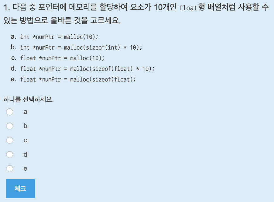 float형 포인터에 float의 사이즈 * 10개만큼 할당하면 된다. 답은 d.
