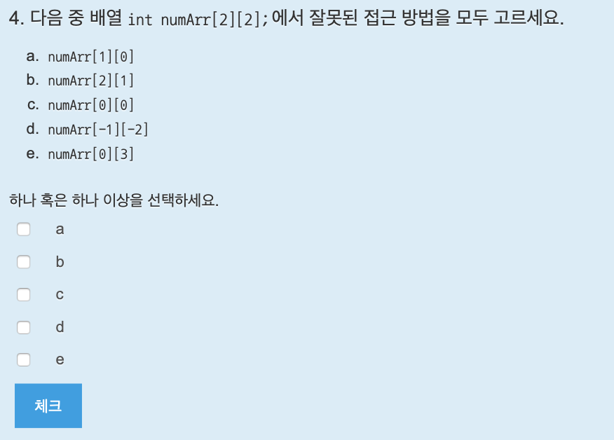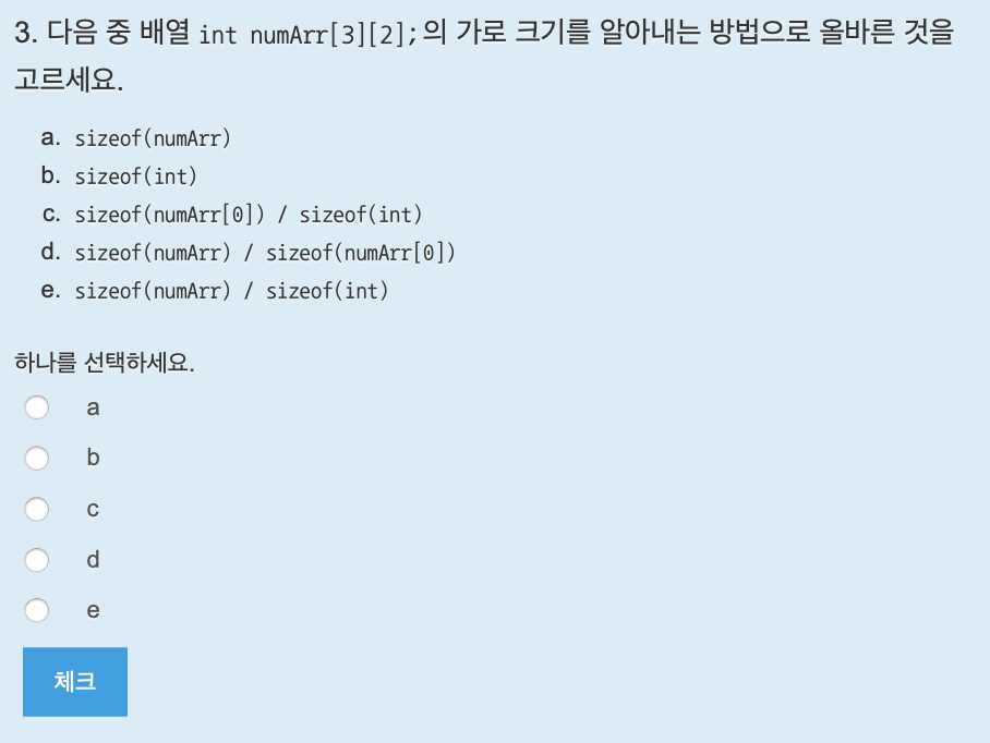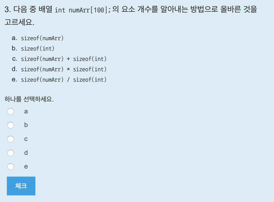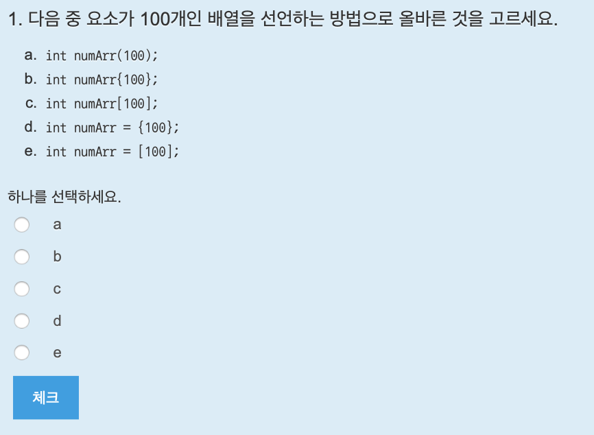 배열의 선언 방법은 자료형 이름[크기]; 이다. 답은 c.