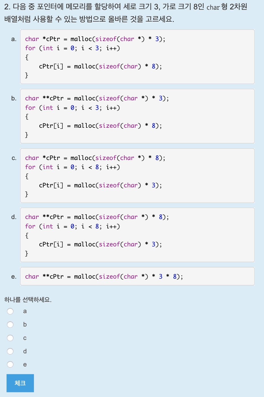 2중 포인터를 선언한 후에 세로 길이 만큼 할당한다. 그 후에 for문을 세로 길이만큼 순회하면서 각각의 줄에 가로 길이만큼 할당해주어야 한다. 답은 b.