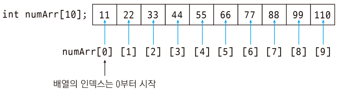 int numArr[10] = { 11, 22, 33, 44, 55, 66, 77, 88, 99, 110 }; // 크기가 10인 int형 배열
