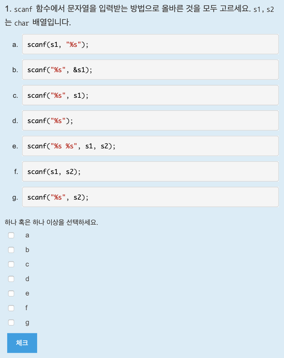 배열은 주소 연산자(&)를 붙이지 않고 사용해야 한다. 답은 c, e, g.