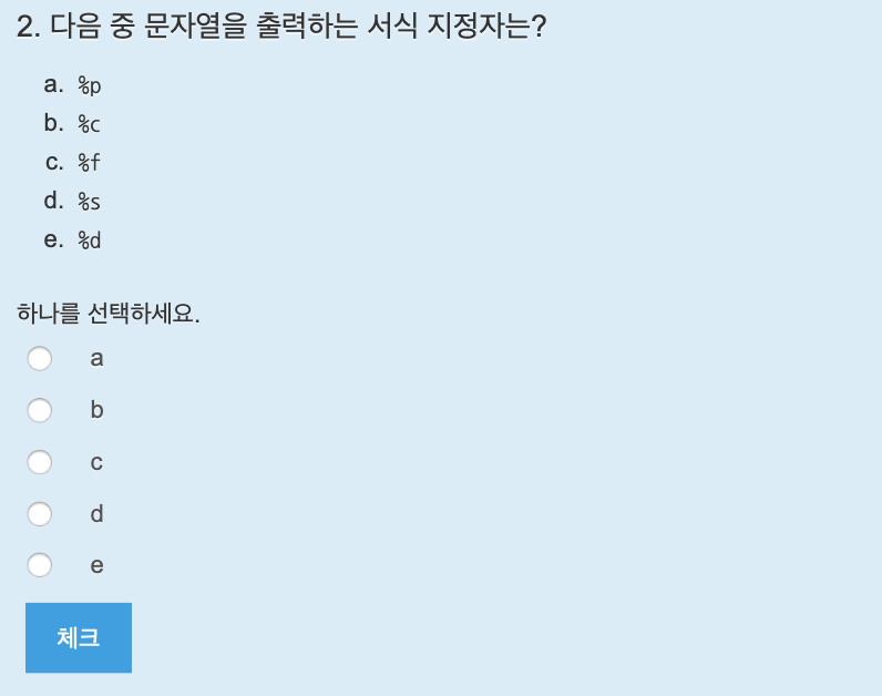 문자열을 출력하는 서식 지정자는 %s이다. 답은 d.