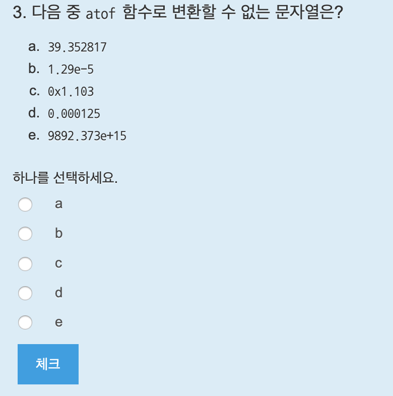 문자열을 실수로 변환할 때 소수점 아래 6자리 소수 혹은 지수표기법으로 변환할 수 있다. 0x1.103은 잘못된 형식이므로 답은 c.