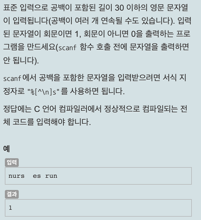 회문이란, 거꾸로 읽었을 때랑 제대로 읽었을 때가 같은 단어 혹은 문장을 뜻한다. C언어를 이용해서 입력 받은 단어가 회문인지를 판별하는 코드는 다음과 같다.
