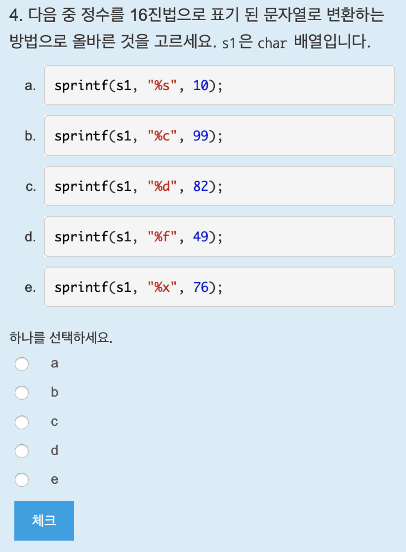16진수의 서식 지정자는 %x이다. 답은 e.