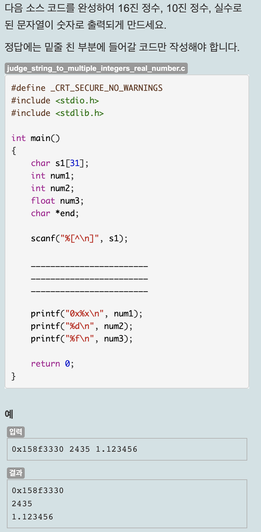 하나의 문자열로 입력받은 각각의 수를 num1, num2, num3에 저장해야 한다. num1, num2는 strtol() 함수를 이용해 변환하고 num3은 strtof() 함수를 이용해 변환해서 저장한다. 이 때 각각의 수가 변환되면 다음 수를 저장할 수 있도록 끝 포인터 end를 이용해야 한다.