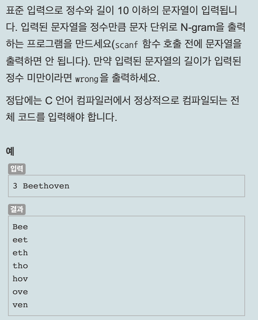 if문을 통해 입력된 길이가 더 작으면 wrong을 출력하고 그렇지 않다면 n-gram을 출력한다. 먼저, 외부의 반복문은 시작점을 정하기 위해 i를 0부터 length-(number-1)까지 반복하고, 내부의 반복문은 j=0부터 j<number까지 반복 출력할 횟수를 정해준다. 그 후에 출력할 땐, s1[i+j]로 시작점부터 j가 반복되는 만큼의 길이의 글자를 출력한다.