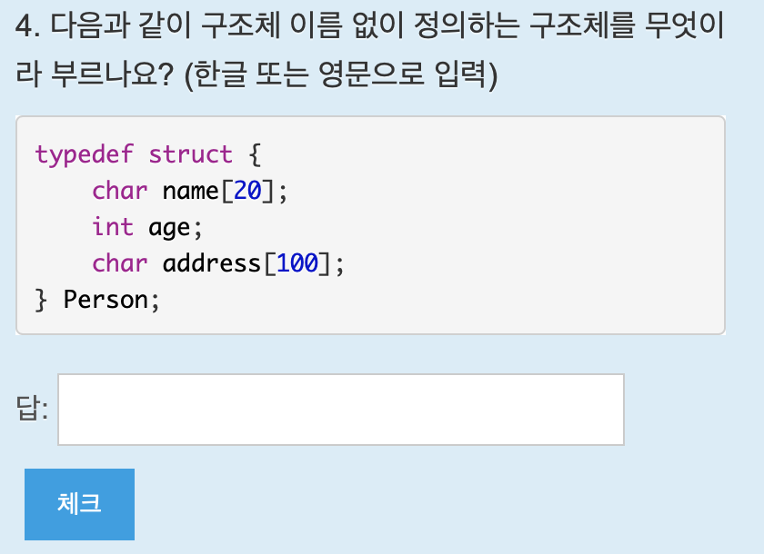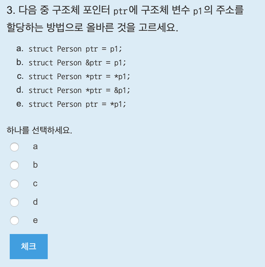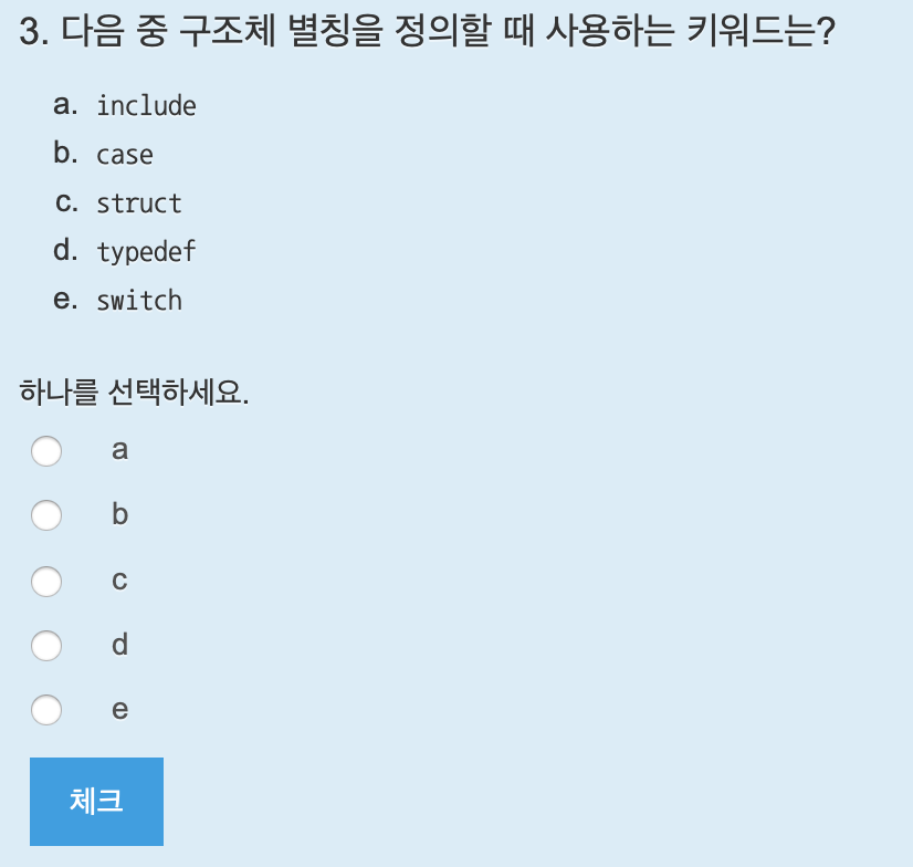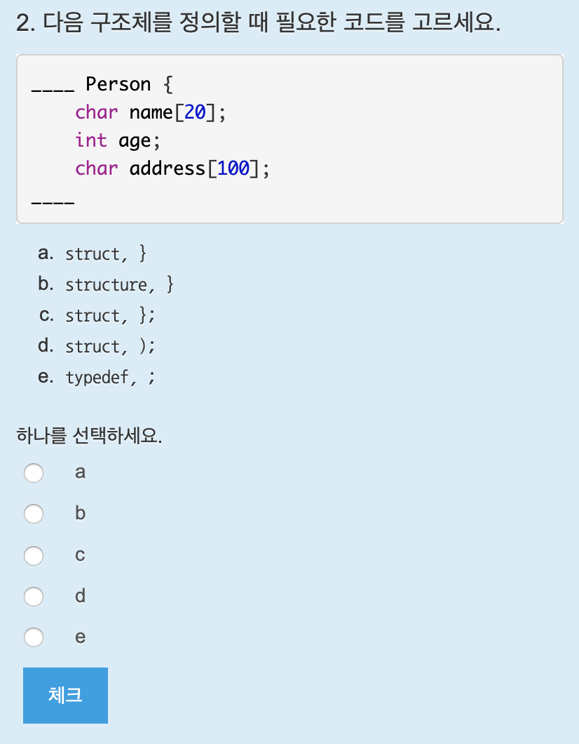구조체를 선언하는 키워드는 struct이다. 답은 c.