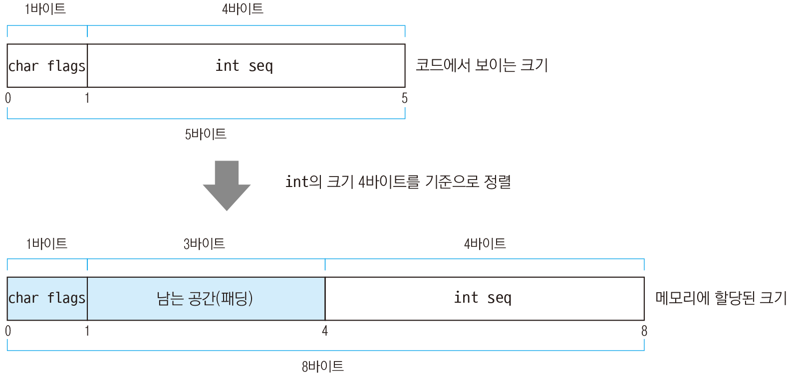 멤버로 문자형 변수와 정수형 변수를 하나씩 가지고 있는 구조체가 있다고 치자. 문자형은 1바이트, 정수형은 4바이트이기 때문에 구조체의 전체크기는 5바이트가 되어야 하지만, 아래의 코드에서 실제 구조체의 크기를 출력해보면 5바이트가 아닌 8바이트가 출력된다.