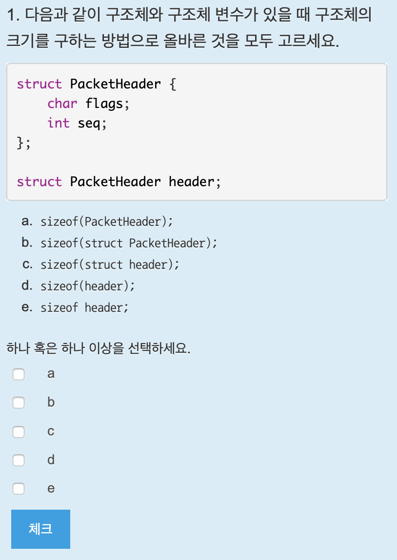구조체의 크기를 구하는 법은 sizeof(struct 구조체 이름), sizeof(구조체 변수이름), sizeof 구조체변수이름 이다. 답은 b, d, e.