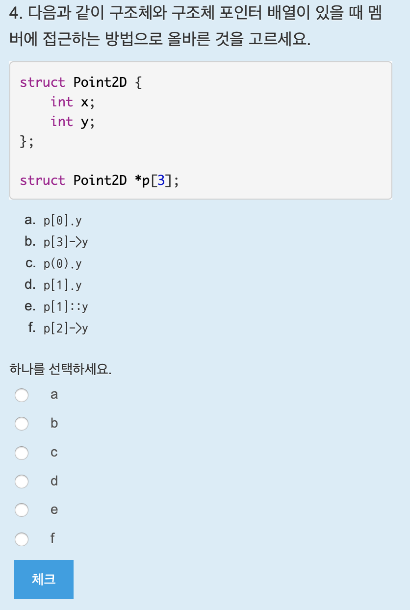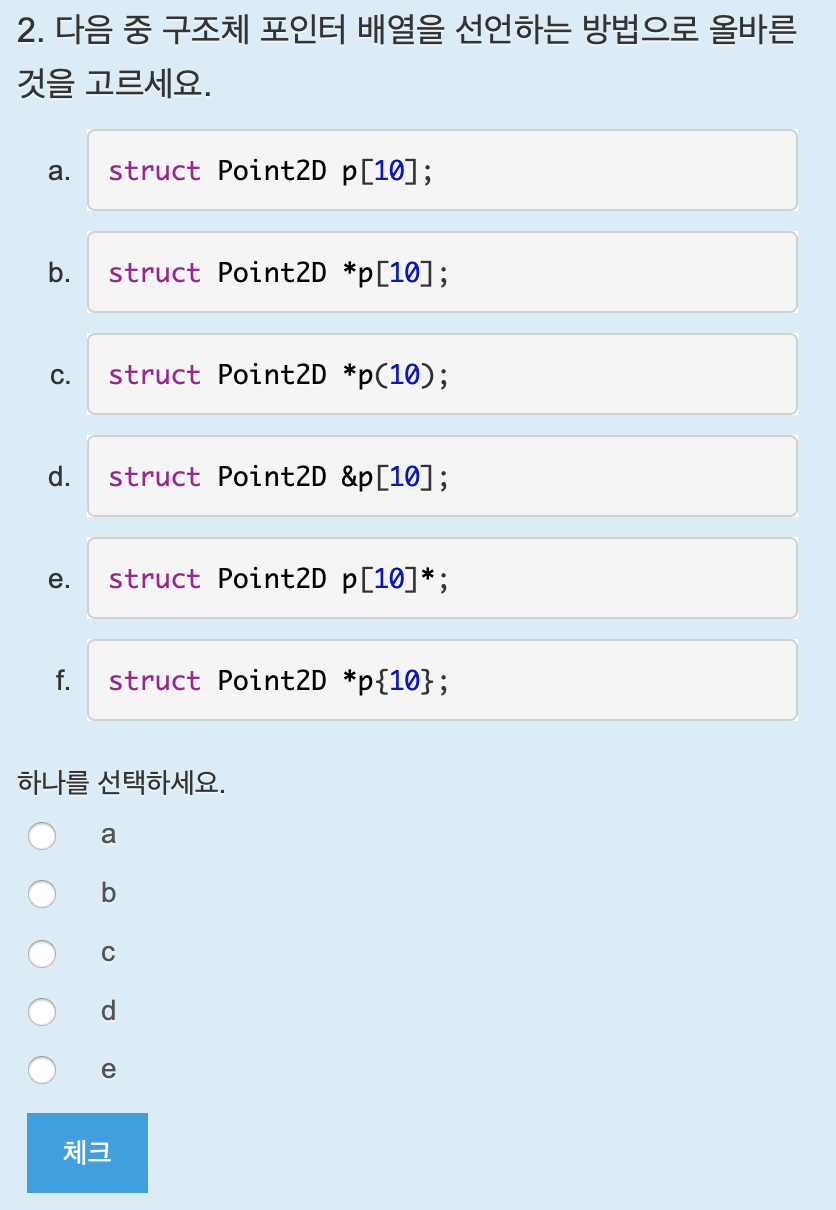 구조체 포인터 배열은 struct 구조체이름 *배열이름[크기]로 선언한다. 답은 b.