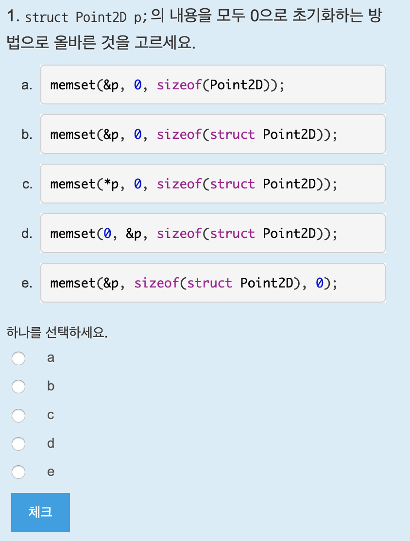 memset 함수의 사용법은 memset(구조체의 주소, 초기화할 값, 구조체 크기)이다. 답은 b.