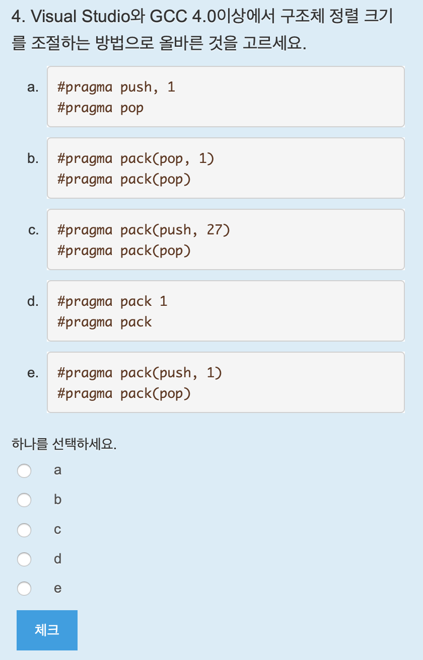 구조체 정렬의 크기를 지시하는 지시자는 #pragma pack(push, 크기), #pragma pack(pop)이다. 답은 e.