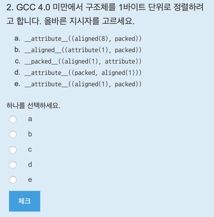 구조체를 정렬하는 지시어는 __attribute__((aligned(크기), packed))이다. 답은 e.