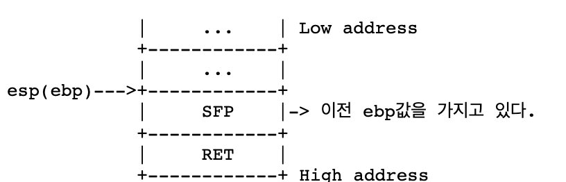 sfp란 Stack Frame Pointer의 약자로, 이전 함수의 EBP 주소를 저장하고 있는 공간을 칭한다. 즉, 새로운 스택 프레임의 ebp에는 이전 스택 프레임의 주소가 저장되어 있다는 뜻이다. 그 위로는 선언한 변수들이 차례로 쌓이게 된다. 그림으로 나타내면 다음과 같다.