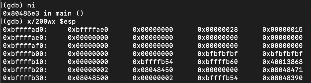 0xbffffae0부터 40바이트가 buffer이고, 그 뒤에있는 0xbffffb08부터 4바이트가 ebp, 그 뒤의 4바이트가 ret임을 알 수 있고, argv[1]의 시작 위치는 0xbffffc5c임을 알 수 있다. 이제 memset을 실행한 후에 상황이 어떤지 보기로 한다.