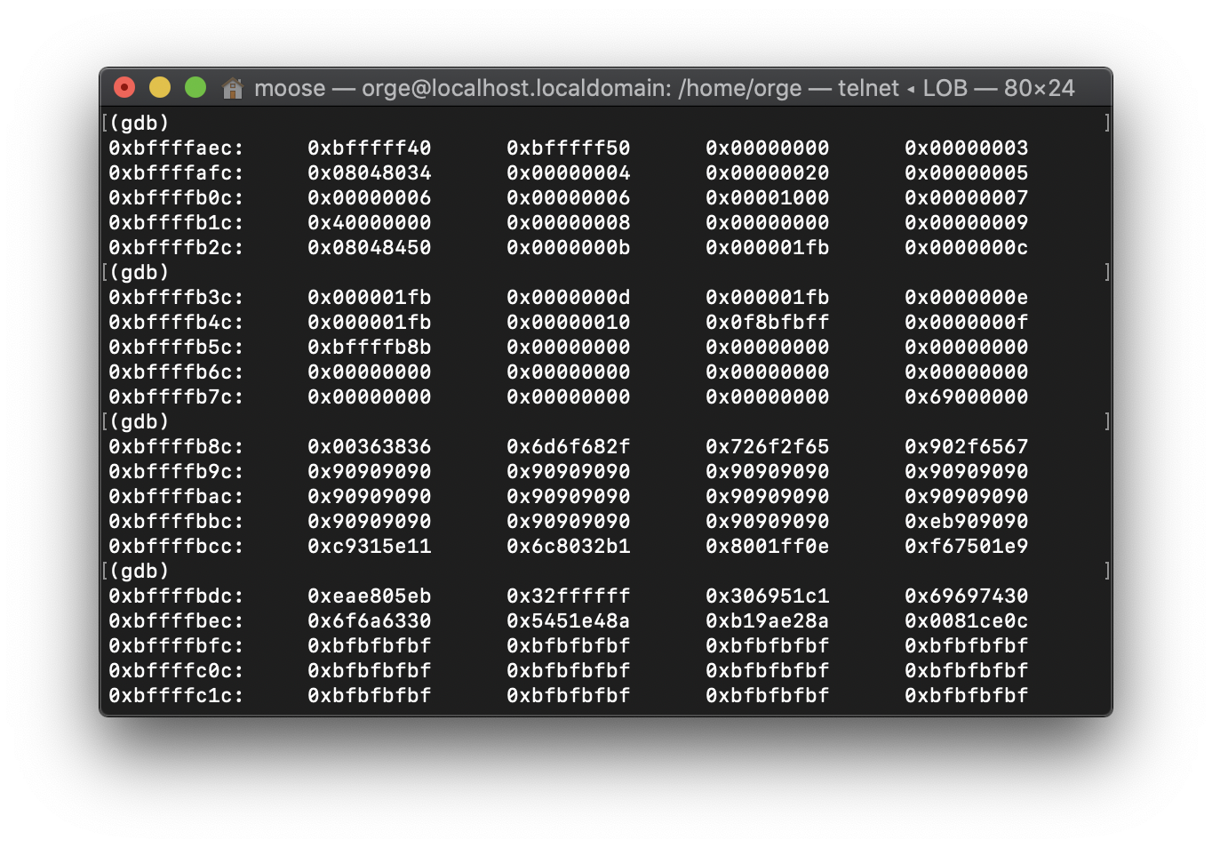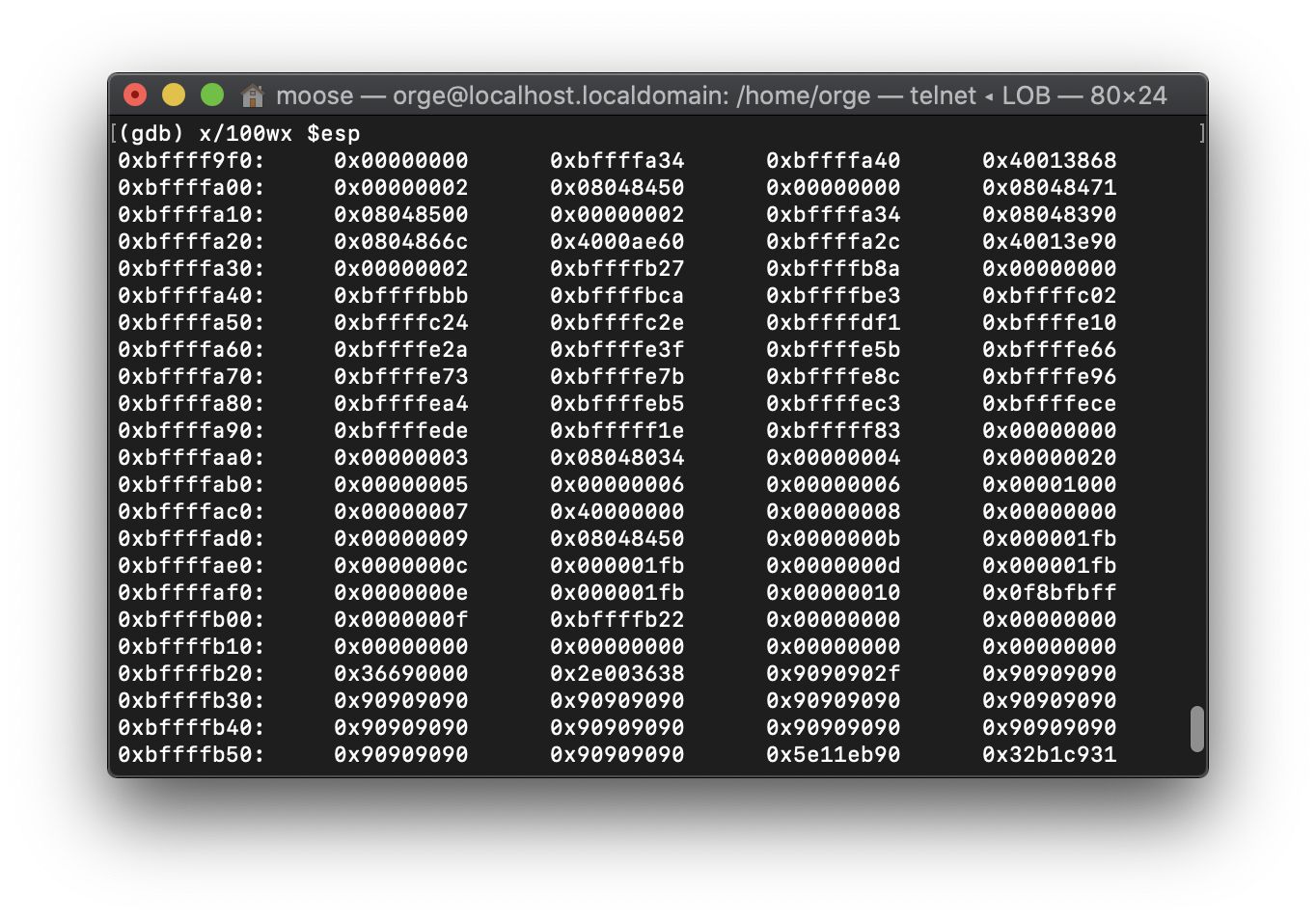 0x90909090이 시작되는 위치가 대략 0xbffffb29이다. ret에 해당 주소를 덮어씌우는 코드를 다시 실행해보았다.